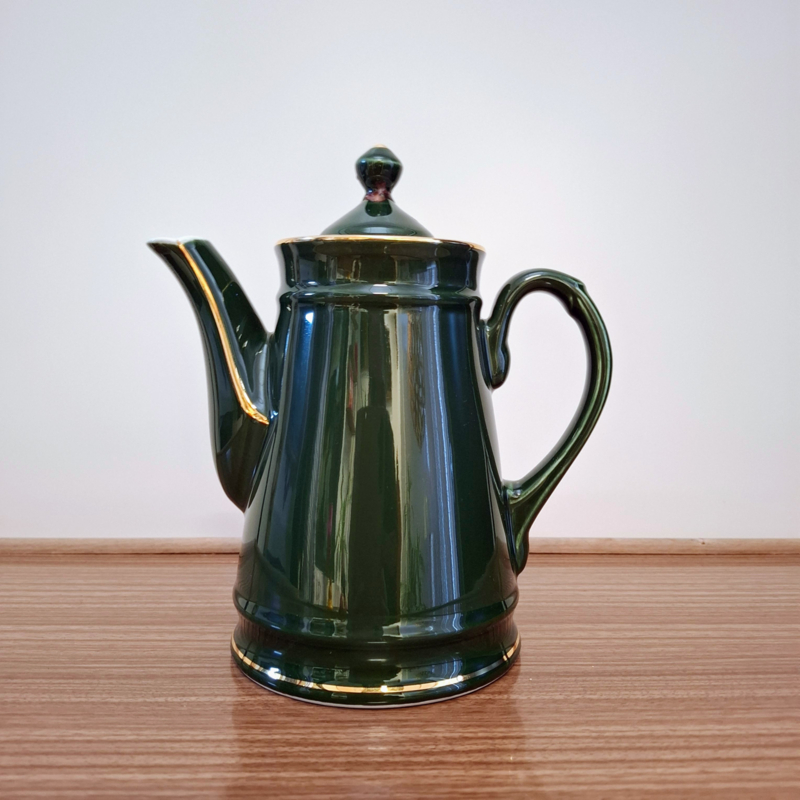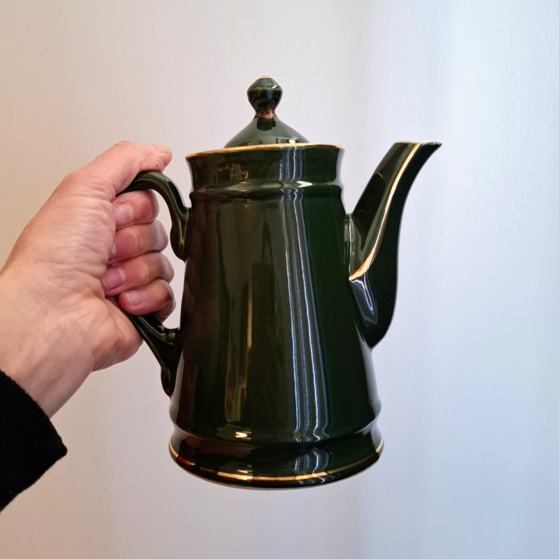 Vintage Theepot - donkergroen keramieken met gouden accenten