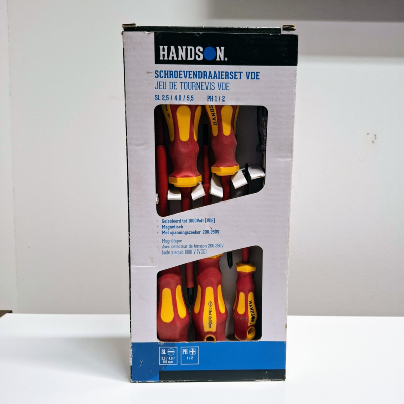 De 6-delige Handson-schroevendraaierset PH-SL 1000V bestaat uit 6 schroevendraaiers, gemaakt van chroom-vanadiumstaal. De 6 schroevendraaiers zijn geschikt voor Phillips-kruiskopschroeven met maat PH1 en PH2 en sleufkopschroeven met afmetingen van 2mm, 4mm, 5mm en 5,5mm. De 6-delige set bestaat dan ook uit een Phillips-1-kruiskopschroevendraaier, een Phillips-2-kruiskopschroevendraaier en 3 platte schroevendraaiers, oftewel sleufkopschroevendraaiers. De 6 PH- en sleufschroevendraaiers uit deze set zijn geïsoleerd tot 1000V. De geïsoleerde schroevendraaiers zijn dan ook voorzien van een VDE-keurmerk. Tevens is de set met PH- en SL-schroevendraaiers voorzien van een spanningzoeker voor het testen van wisselspanning van 120V tot 250V.
