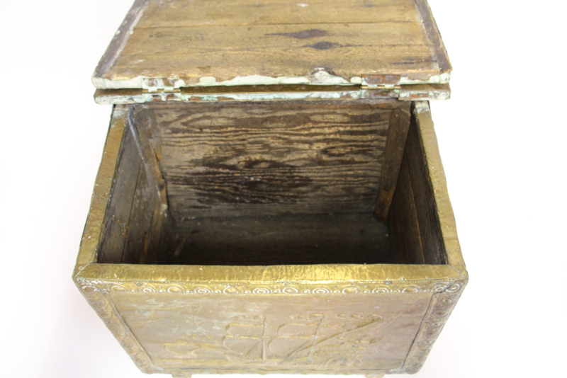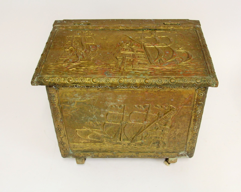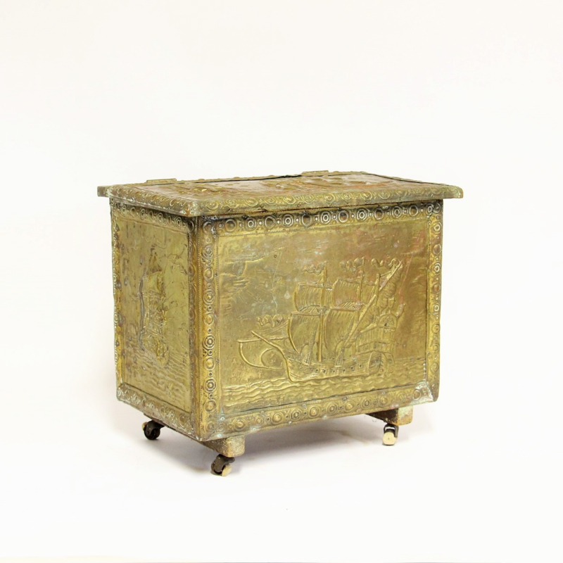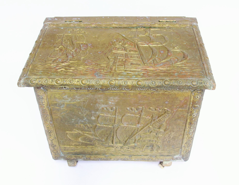 Koperen Turfkist met decor van schepen in reliëf - ca. 1900