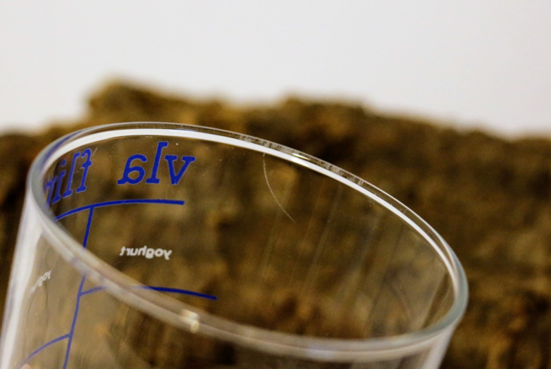 Hier en daar de tekst wat vervaagd en op 1 glas zit een krasje aan de binnenkant, zie foto.