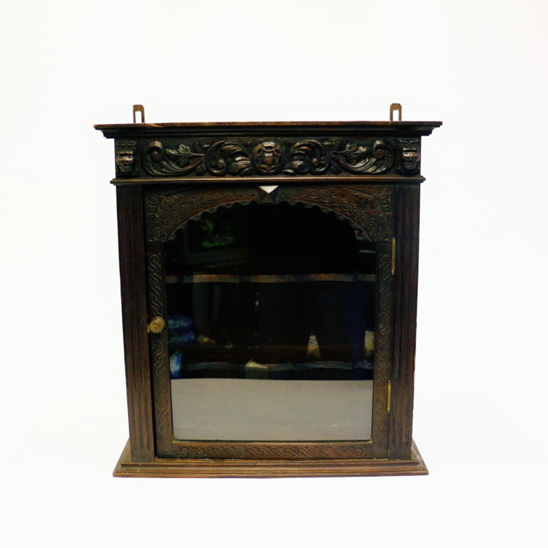 Een antiek Mechels eikenhouten hang- / vitrine kastje. Geheel bewerkt en uitgesneden leeuwenkopjes Aan de binnenzijde 2 plankjes B 51,5 cm x D 8 cm x H 56 cm Kleine beschading bovenop het kastje, zie foto's.