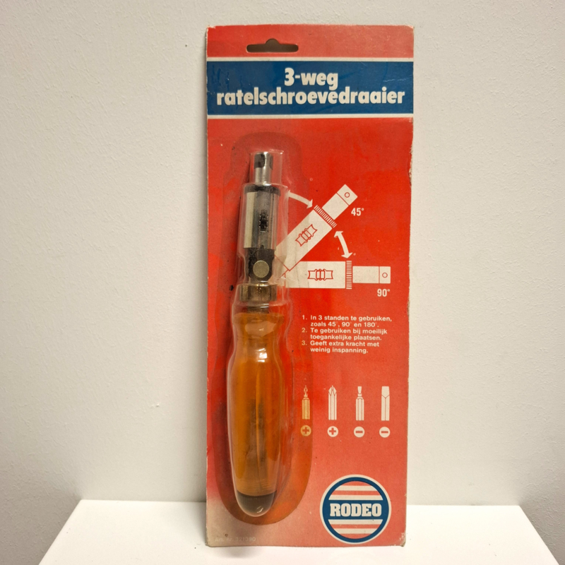 3 weg Ratelschroevendraaier - RodeoVinatage 3 weg Ratelschroevendraaier van het merk Rodeo. Nog nieuw in de verpakking!
